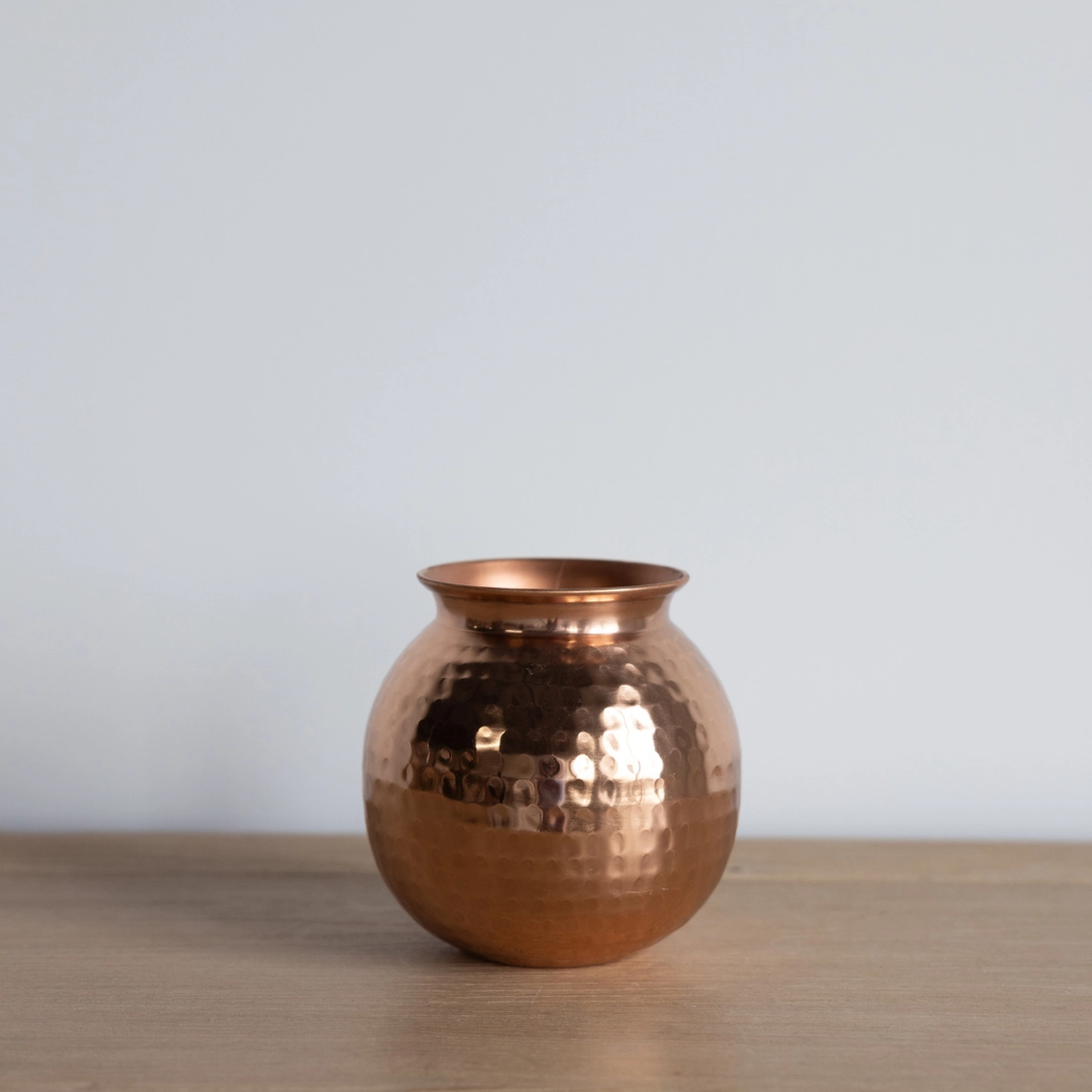 The Copper Hammered Flower Vase is crafted from high quality copper for durability and long lasting decorative appeal. Its hammered texture adds a tactile, artisanal feel to your everyday decor. Style it on a shelf with faux or dried botanicals to enhance any room with elegance.